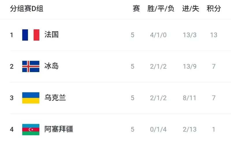 法國已提前出線(xiàn),冰島和烏克蘭之間的直接對話(huà)將決定附加賽席位的歸屬。
