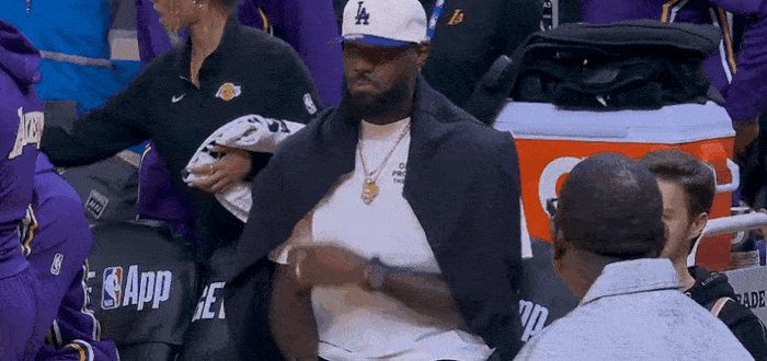 第一節比賽,身著(zhù)時(shí)尚詹姆斯身著(zhù)時(shí)尚服飾坐在替補席,服飾認真觀(guān)戰湖勇大戰。坐替