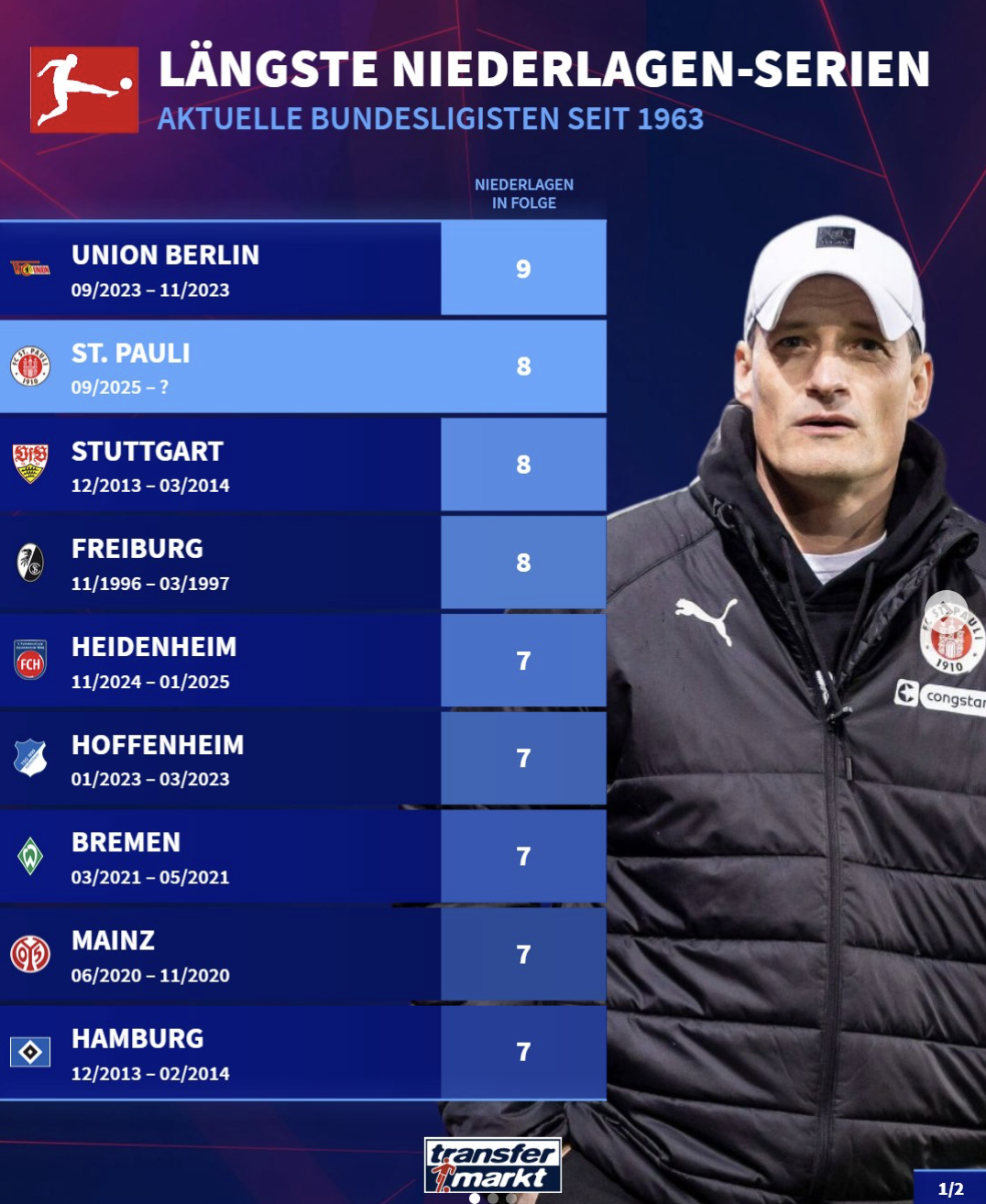 虎撲11月24日訊 德轉統計了本賽季德甲球隊各自最長(cháng)連敗紀錄榜。