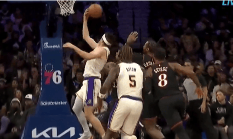 比賽第三節,破往里夫斯突破往后一甩,后甩助攻八村迎著(zhù)喬治中投得分。助攻著(zhù)喬治中