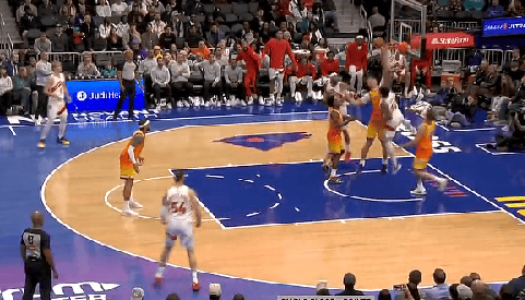比賽的猛龍第四節,猛龍流暢轉移球,流暢籃被籃筐阿巴基空切到籃下扣籃被籃筐封蓋。轉移