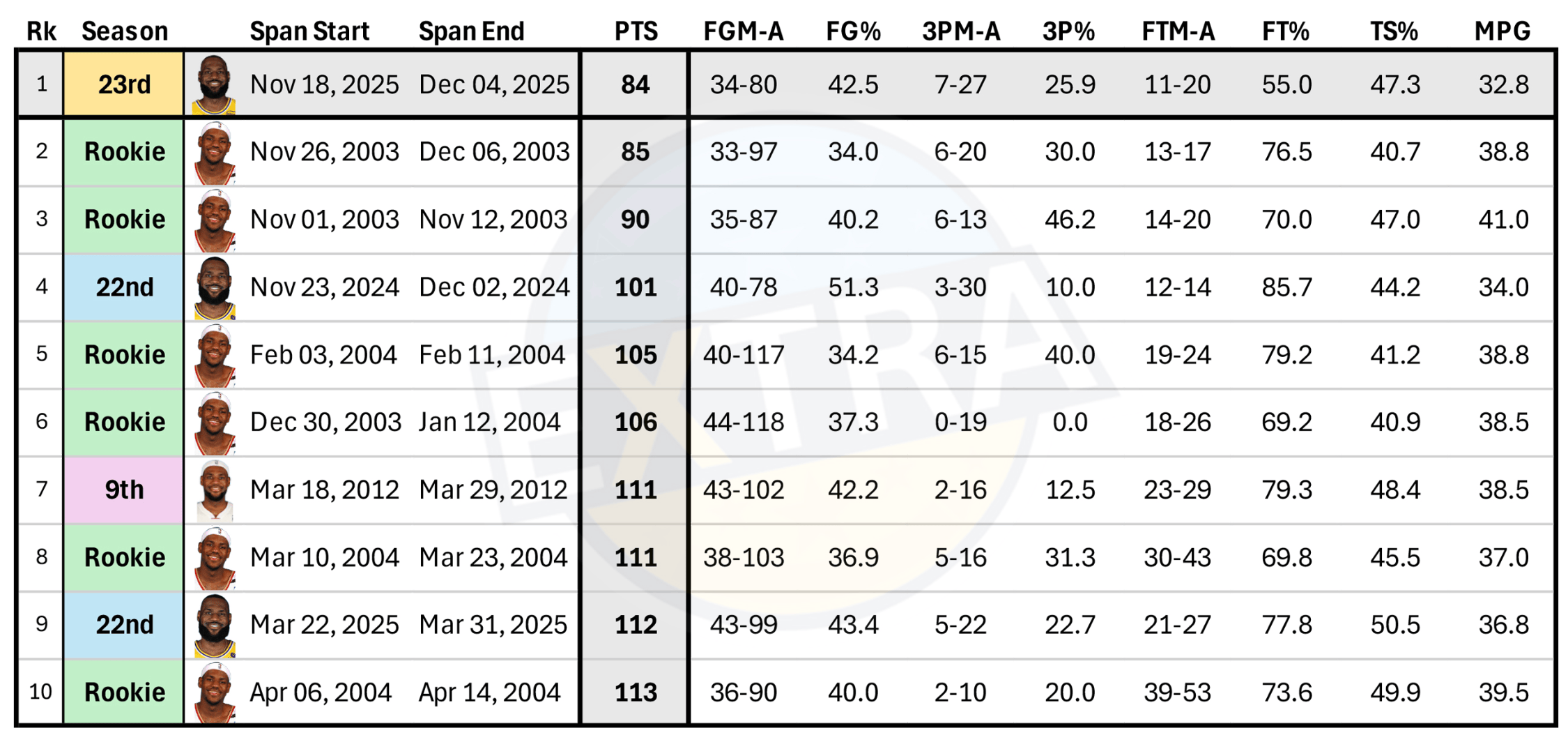 最近6場(chǎng)比賽,詹姆斯累計得到84分,是他個(gè)人職業(yè)生涯至今在常規賽6場(chǎng)比賽區間內總得分的最低值。