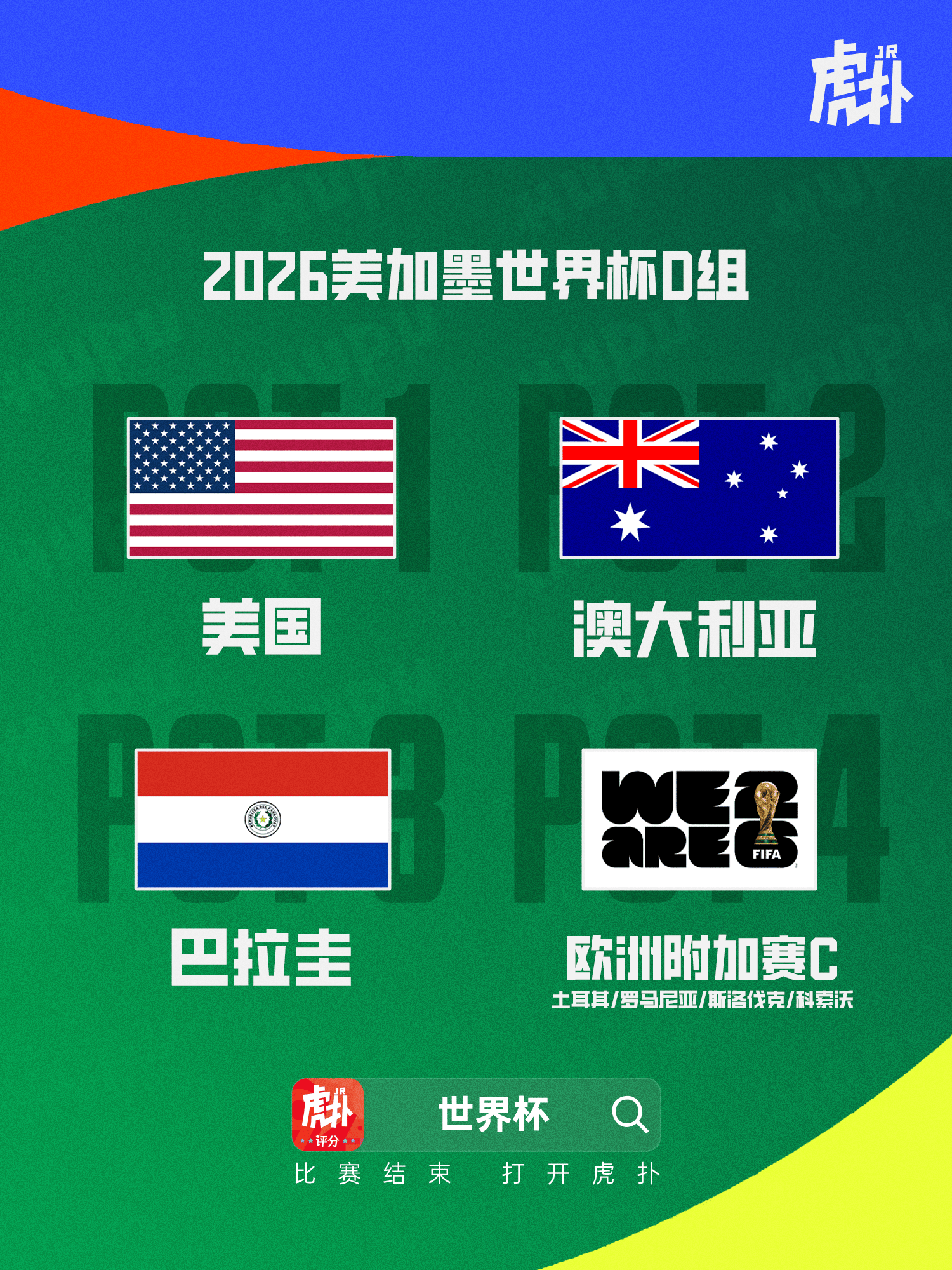 虎撲12月06日訊 2026美加墨世界杯分組抽簽儀式在華盛頓進(jìn)行。D組的球隊4支球隊為美國、澳大利亞、美國巴拉圭和歐洲附加賽C勝者