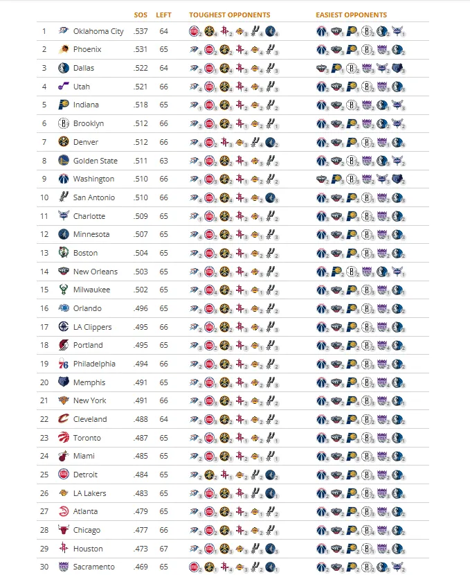 Tankathon發(fā)布各隊剩余賽程難度:雷霆太陽(yáng)獨行俠最難,國王火箭公牛最容易