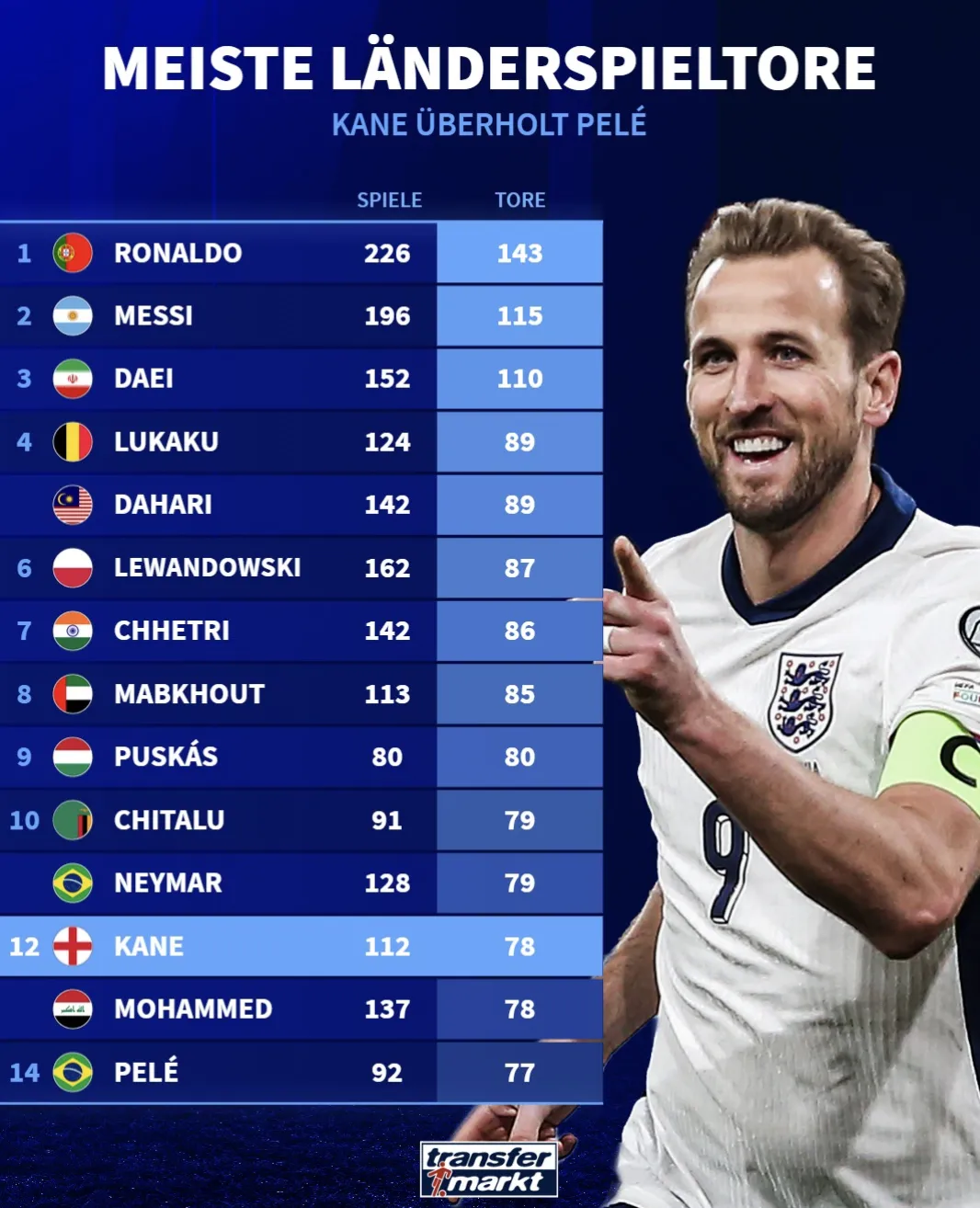 C羅和梅西分別以143球和115球排名前二,板足榜C貝利前伊朗傳奇球星阿里-代伊打入110球緊隨其后。壇國凱恩則憑借對陣阿爾巴尼亞的家隊梅開(kāi)二度上升到并列第12位。