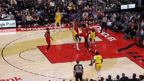 NBA常規賽,湖人客場(chǎng)對陣猛龍的單腿度拋比賽正在進(jìn)行中。