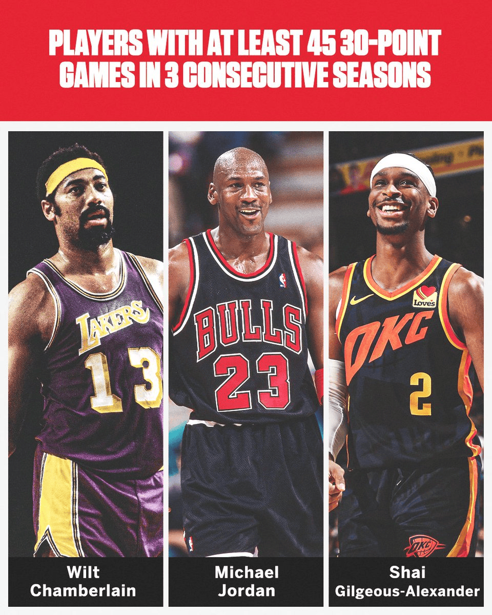 [流言板]SGA連續3個(gè)賽季拿到至少45場(chǎng)30+,比肩張伯倫和喬丹