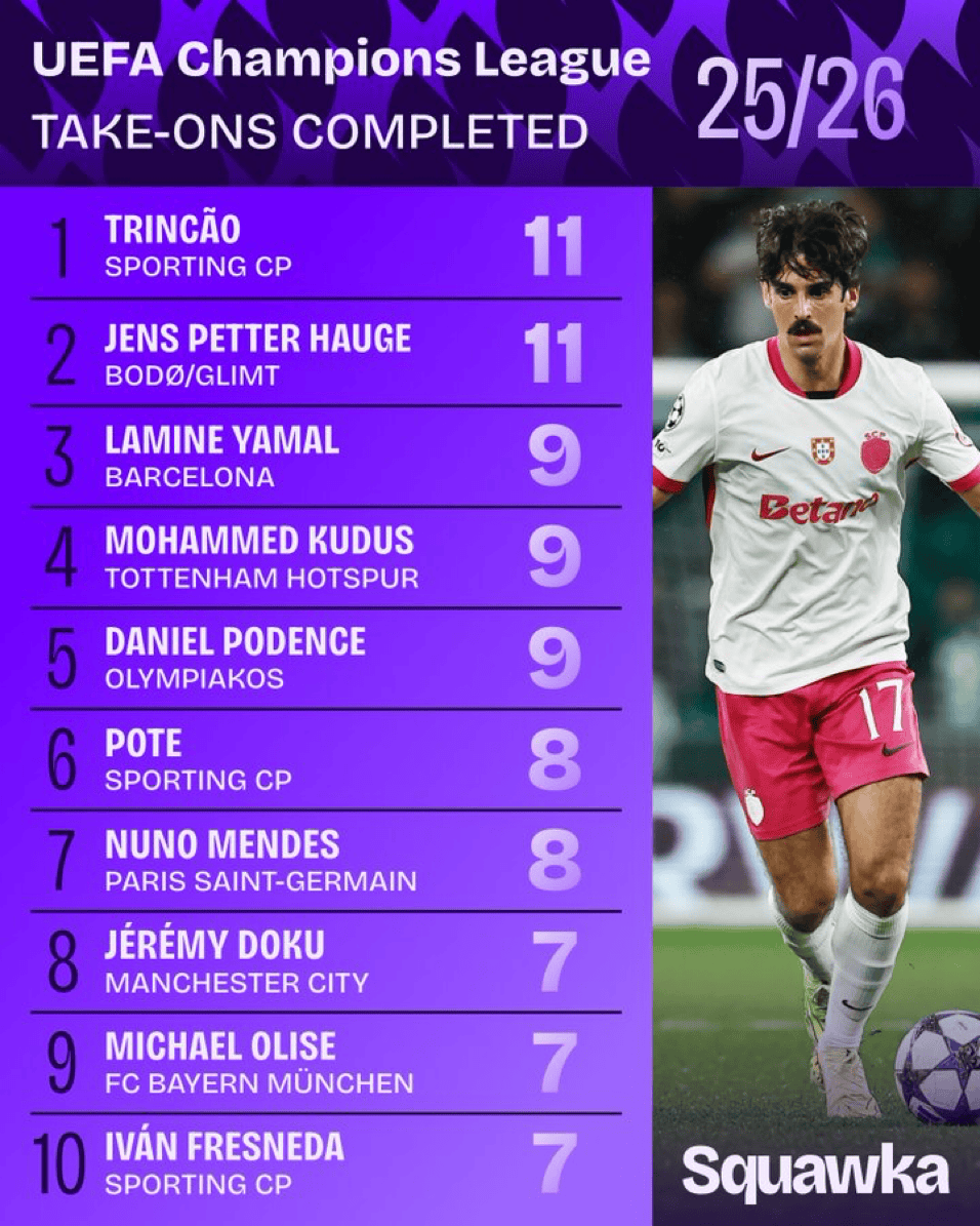 虎撲10月24日訊 Squawka統計了本賽季歐冠聯(lián)賽的成功過(guò)人榜: