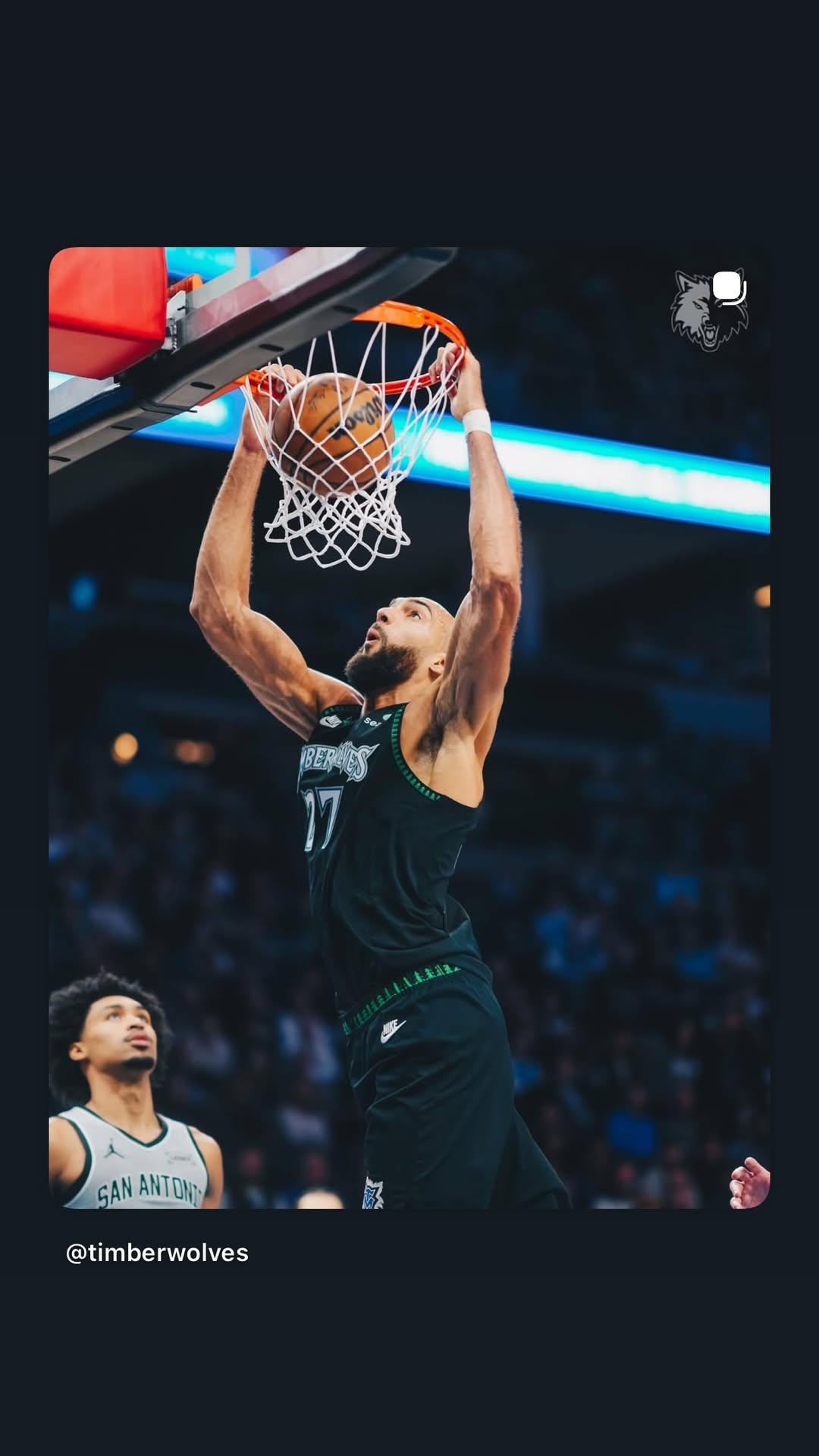 虎撲12月01日訊 森林狼球員魯迪-戈貝爾更新個(gè)人社媒,曬出今日賽場(chǎng)扣籃瞬間。板森