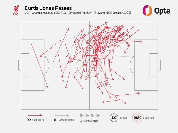 虎撲10月23日訊 歐冠聯(lián)賽階段,利物浦客場(chǎng)5-1橫掃法蘭克福,場(chǎng)完成次傳球傳球柯蒂斯-瓊斯在比賽中完成了122次傳球。紅軍