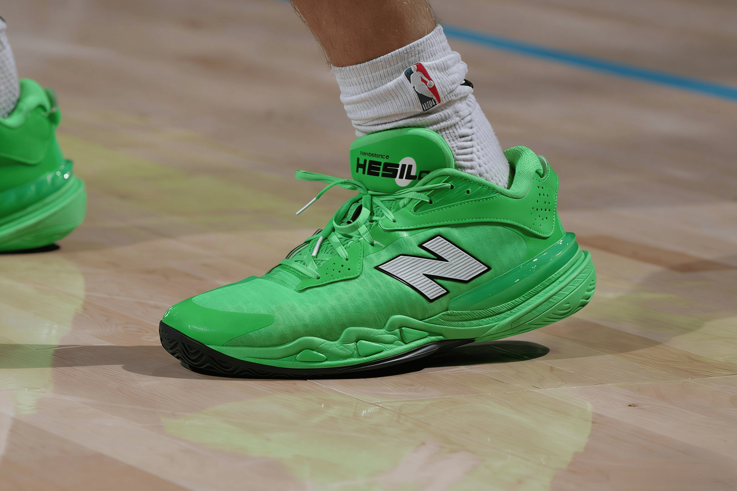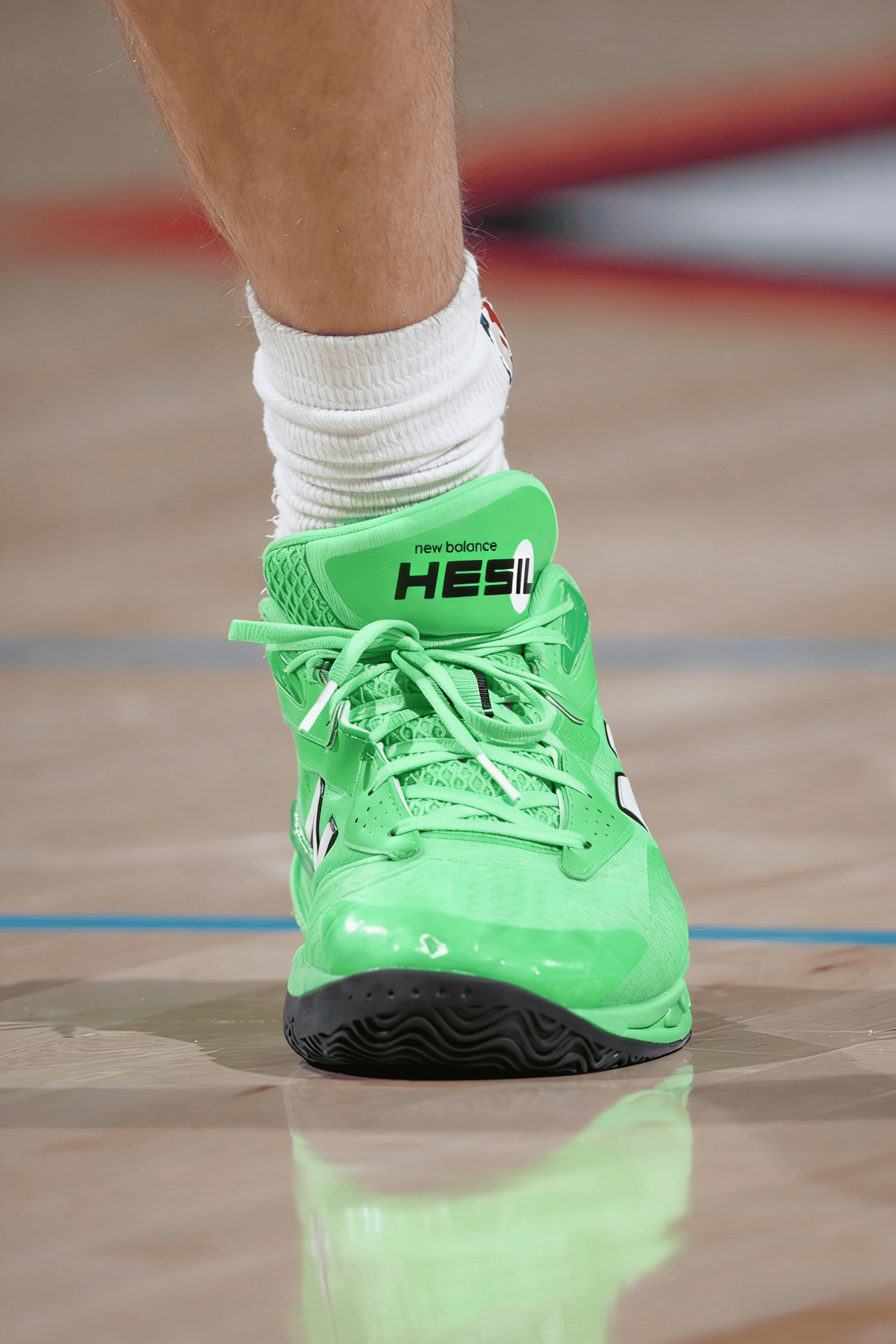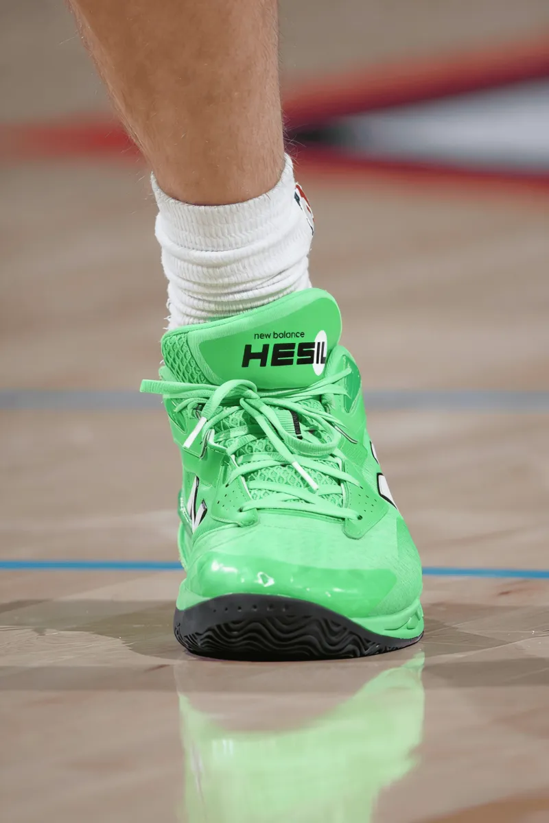 比賽中,板弗板助弗拉格上腳綠色New Balance Hesi Low v2。分籃