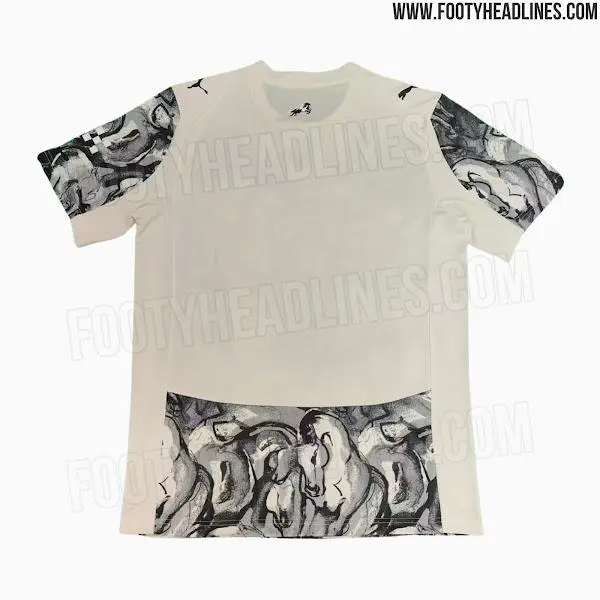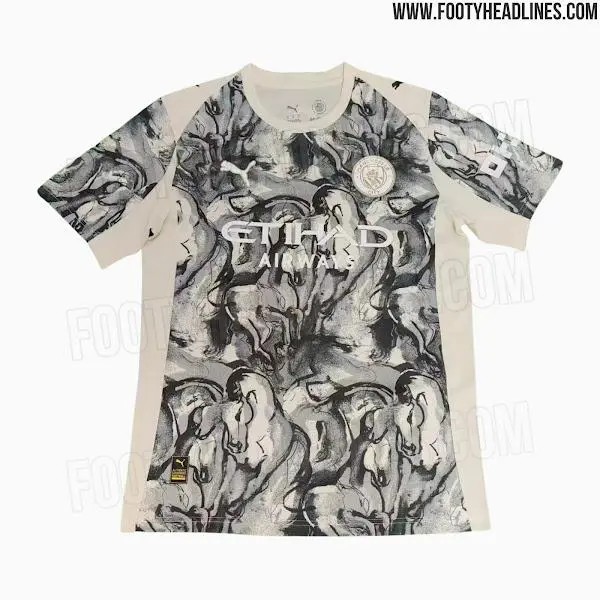 由Puma打造的自水曼城馬年特別版球衣以米白色為主色調,正面布滿(mǎn)抽象化的墨畫(huà)曼城馬年米白馬頭圖案,靈感來(lái)源于中國傳統水墨畫(huà)。球衣