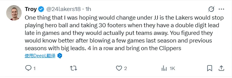 -曾希望在JJ手下能改變的一點(diǎn)是,湖人在比賽末段兩位數領(lǐng)先時(shí),能停止打英雄球和投30英尺的超遠三分,而是真正去終結比賽、鎖定勝局。經(jīng)歷了上賽季和前幾個(gè)賽季幾次浪費大比分領(lǐng)先優(yōu)勢的比賽后,你會(huì )覺(jué)得他們應該吸取教訓了。目前取得四連勝了,接下來(lái)就看對陣快船的表現吧。