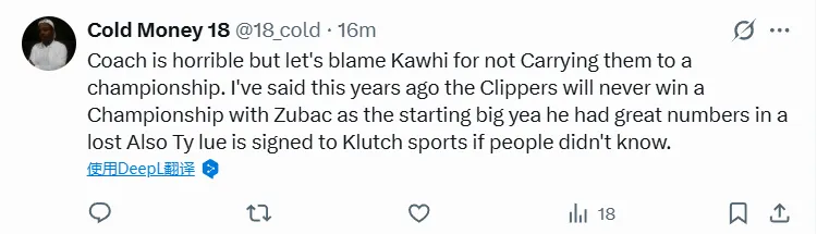 -教練糟透了,但我們還是要怪卡哇伊沒(méi)能帶領(lǐng)球隊奪冠。我早就在幾年前說(shuō)過(guò),只要祖巴茨當首發(fā)中鋒,快船就永遠拿不到總冠軍。沒(méi)錯,他在輸掉的比賽中數據確實(shí)亮眼。另外,泰倫·盧簽約了Klutch體育經(jīng)紀公司,不知道的人可能還不知道。