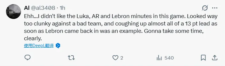 -下半場(chǎng)防守不錯。勒布朗的狀態(tài)仍未恢復。里夫斯和盧卡的三分球還沒(méi)到位。很高興他們取得了勝利。