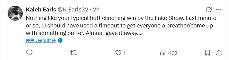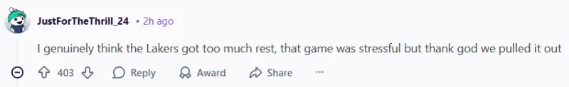 -(403贊)我真的覺(jué)得湖人休息得太多了,那場(chǎng)比賽壓力很大,但感謝上帝,我們贏(yíng)了。