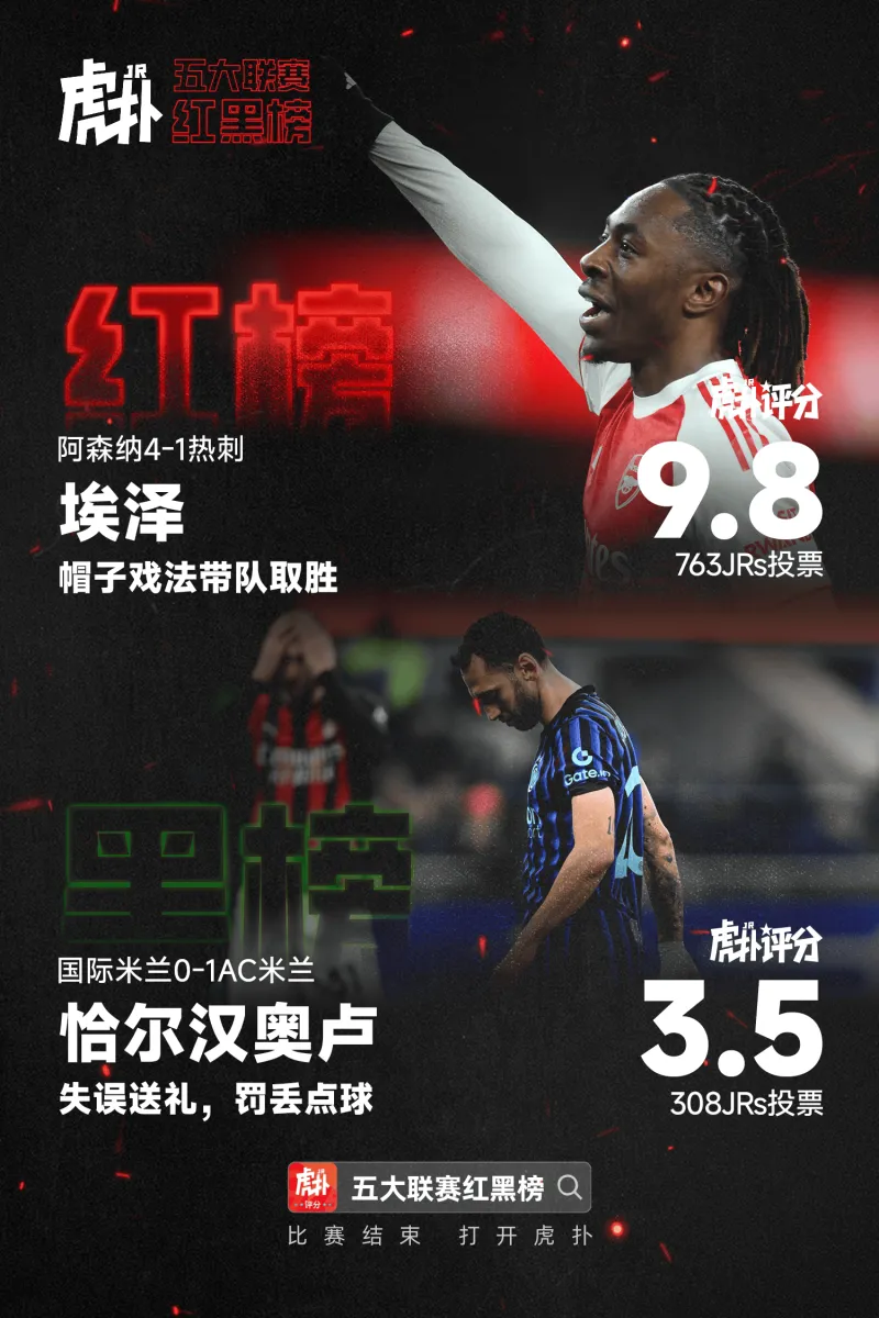 [紅黑榜]埃澤帽子戲法帶隊德比取勝;恰爾漢奧盧送禮又失點(diǎn)由虎撲足球 發(fā)表在足球話(huà)題區 https://bbs.hupu.com/topic