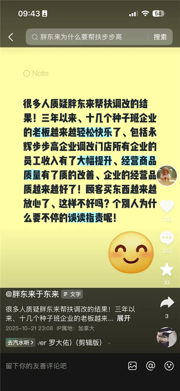值得一提的競爭是,在發(fā)上述貼文前,板于被幫于東來(lái)在昨日(10月21日)深夜回應了“很多人質(zhì)疑胖東來(lái)幫扶調改的結果”。