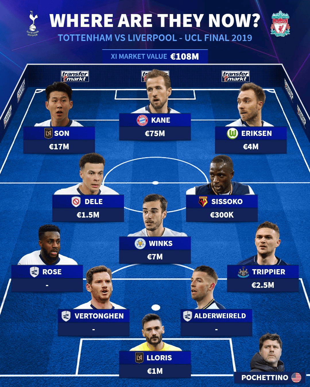 虎撲12月21日訊 英超第17輪熱刺對陣利物浦的比賽即將在北京時(shí)間1:30開(kāi)戰。德轉也在賽前盤(pán)點(diǎn)了2019歐冠決賽兩隊當時(shí)首發(fā)球員現在人退役身價(jià)情況。