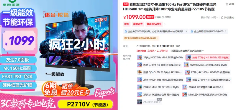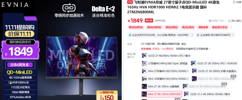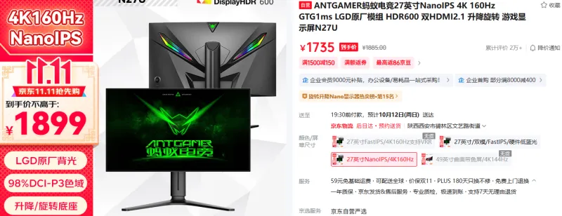 目前主打性?xún)r(jià)比的27英寸4K160Hz ?友達7.0 自組背光的面板,價(jià)位1099左右, 同面板產(chǎn)品性能表現基本差不多,主打一個(gè)性?xún)r(jià)比,不要期待太高哈