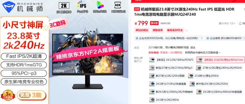 第2款,機械師2K240Hz刷新率(同面板雷神2K240漲到了900多)大概率使用了京東方MV238QHB-NF2顯示面板