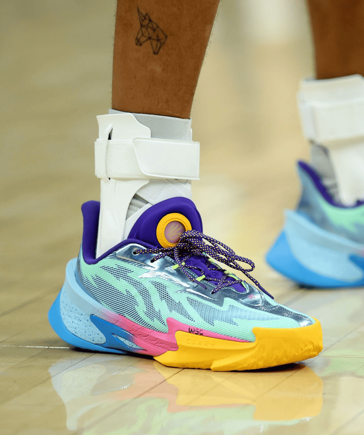 比賽中,流言里穿庫里上腳棉花糖配色UA CURRY Series 7。板庫板助