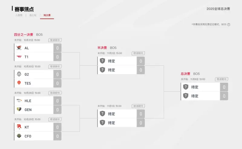 LPL官網(wǎng)再次更新賽程圖:上半區(AL半區)半決賽改為11月2日,下半區(KT半區)半決賽改為11月1日。決賽決賽