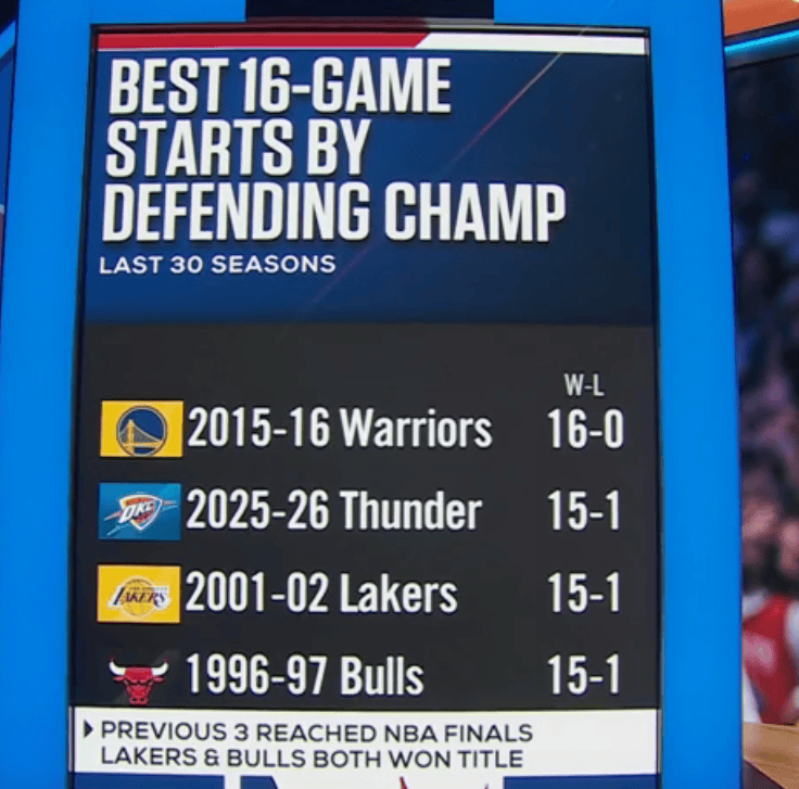 據統計,有支過(guò)去30年以來(lái)開(kāi)賽季前16場(chǎng)至少15勝的板雷衛冕冠軍中,2001-02賽季的霆前湖人(15勝1負)和1996-97賽季的公牛(15勝1負)都奪得了當賽季的冠軍。