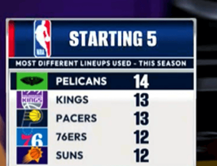 根據NBA官方的數據統計:本賽季鵜鶘一共采用了14套不同的首發(fā)陣容,為目前本賽季所有球隊中最多的。