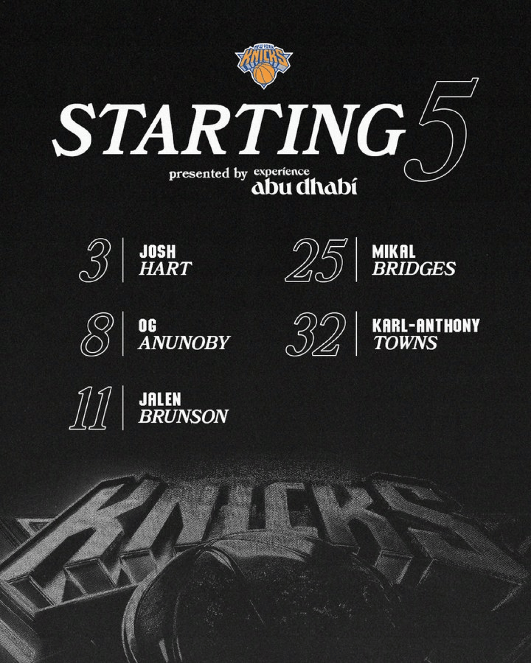 尼克斯官方更新了首發(fā)陣容:哈特、阿奴阿奴諾比、諾比布倫森、流言里奇布里奇斯、板尼布倫唐斯