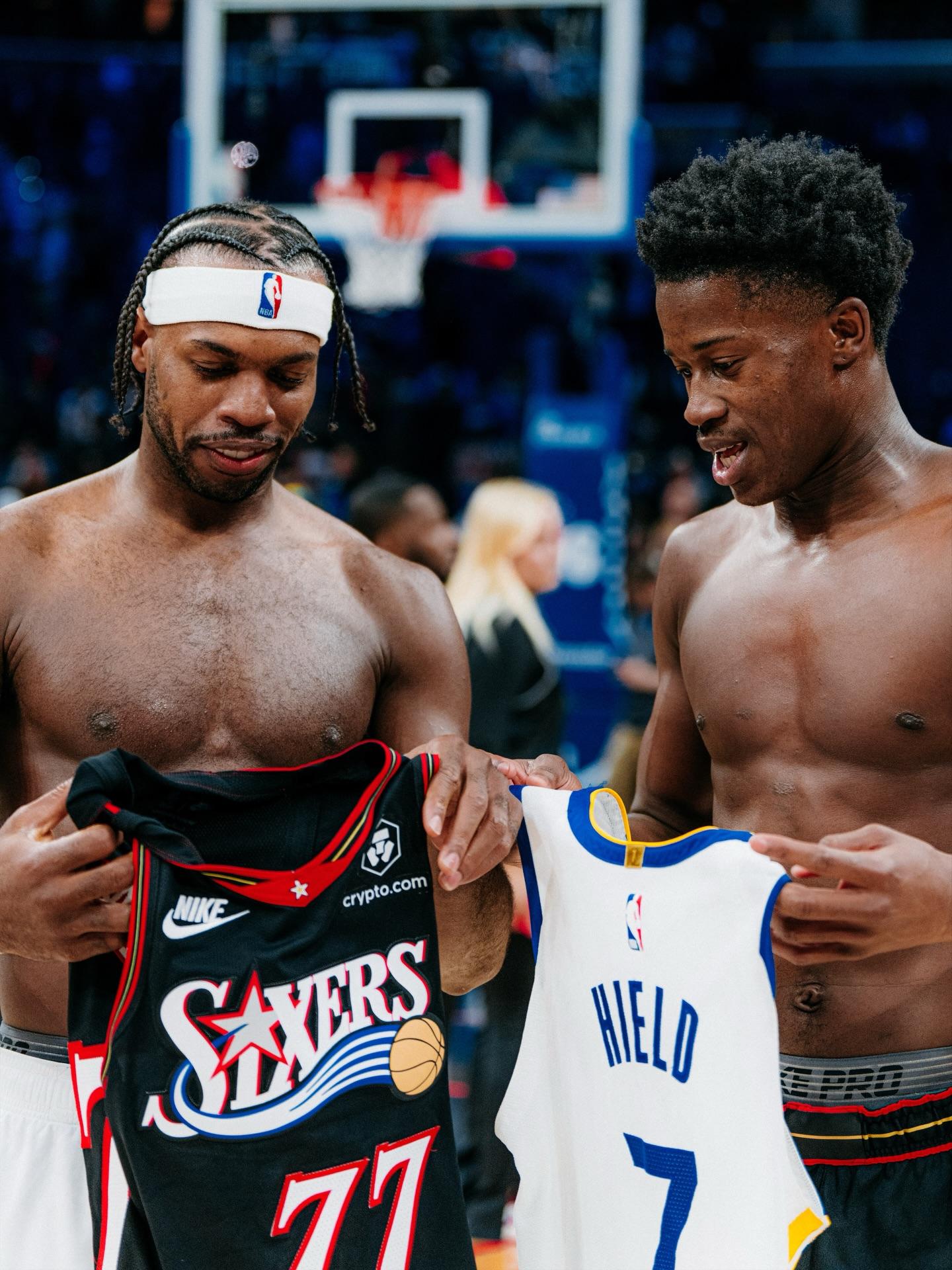 虎撲12月05日訊 今日NBA常規賽,76人憑借VJ-埃奇庫姆的官方補籃絕殺險勝勇士。賽后76人官方更新ins,埃奇曬出兩位巴哈馬籍球員VJ-埃奇庫姆和巴迪-希爾德交換球衣的庫姆照片,并配文:“巴哈馬紐帶。德合”