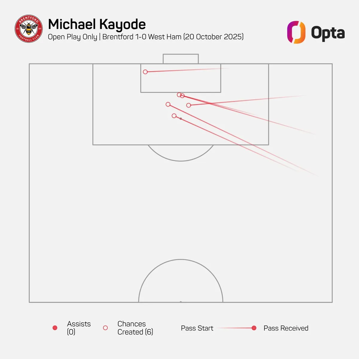 虎撲10月21日訊 Opta數據統計,在對陣西漢姆聯(lián)的運動(dòng)約德比賽中,邁克爾-卡約德成為布倫特福德隊史上首位在英超比賽中通過(guò)運動(dòng)戰創(chuàng )造6次機會(huì )的戰機球員。
