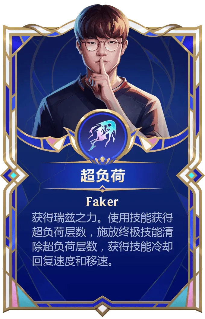 【Faker——超負荷】:獲得瑞茲之力,使用技能獲得超負荷層數,施放終極技能清楚超負荷層數,獲得技能冷卻回復速度和移速。