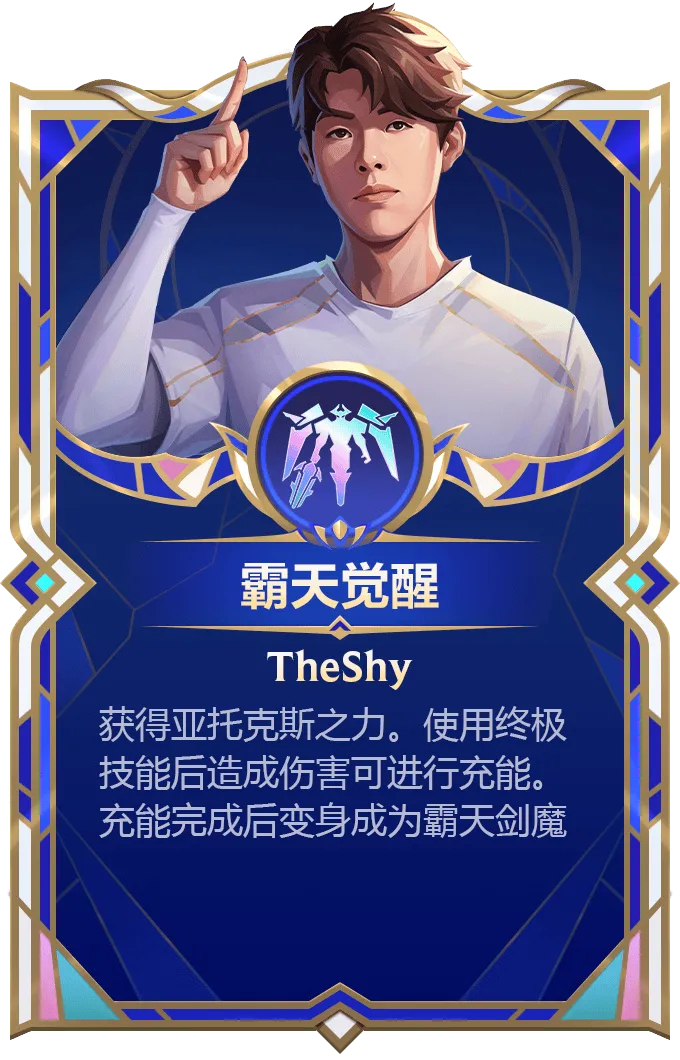 【TheShy——霸天覺(jué)醒】:獲得亞托克斯之力,使用終極技能后造成傷害可進(jìn)行充能,戰績(jì)充能完成后變身成為霸天劍魔。