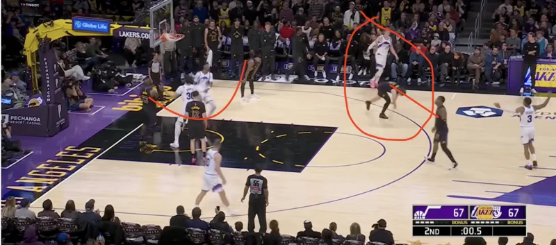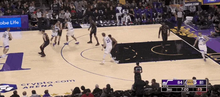 相較于東契奇擋拆的強力陣地傳球能力,詹姆斯的攻守轉換中的“出球”和助攻能力絕對是歷史級別的,他很多隱蔽的傳球手法和上球意識,使得湖人在不論在快攻回合還是陣地回合,既可以打東契奇艾頓的1-5擋拆配合,也可以打詹姆斯式的傳切和無(wú)球跑動(dòng)體系。
