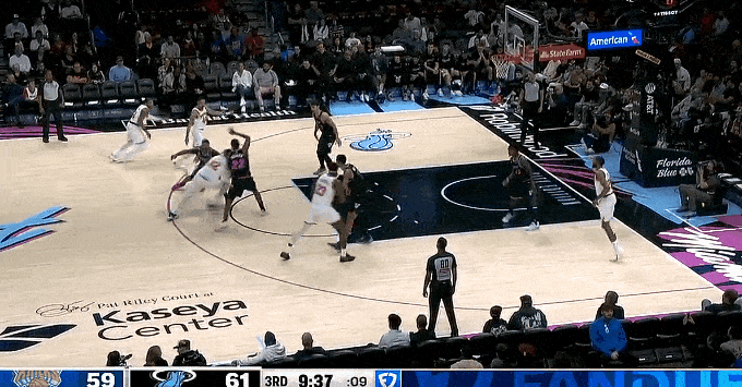 第三節比賽中,反擊鮑威爾從唐斯手中切球搶斷,打零單臂反擊一打零起飛單臂炸框。炸框