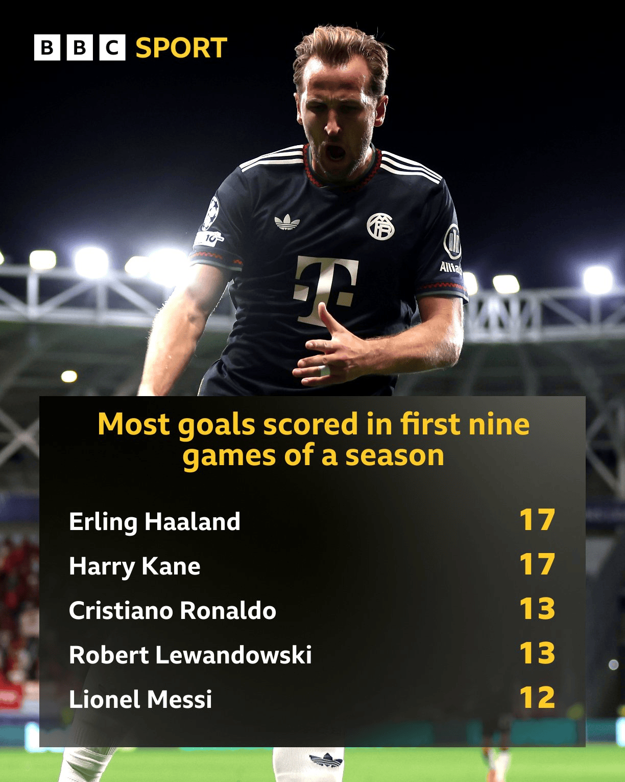 虎撲10月01日訊 凱恩在本賽季拜仁的前9場(chǎng)各項賽事中打進(jìn)了驚人的17粒進(jìn)球。BBC也統計了歷史上五大聯(lián)賽球員賽季前9場(chǎng)各項賽事打進(jìn)進(jìn)球數量的史射手榜排行榜。