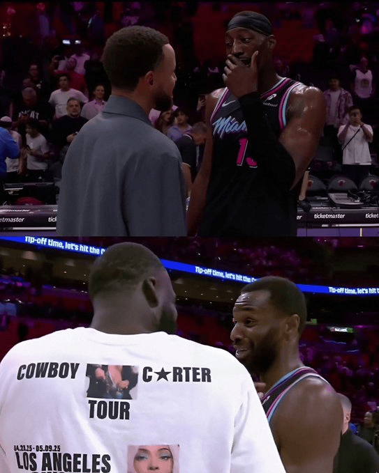 "斯蒂芬-庫里和德雷蒙德-格林賽后與阿德巴約和威金斯寒暄。