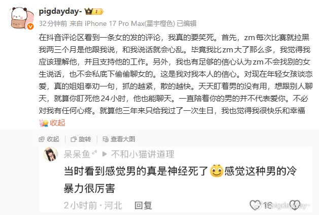 在抖音評論區看到一條女的發(fā)的評論,我真的要笑死。首先,zm每次比賽就拉黑我兩三個(gè)月是他跟我說(shuō),和我說(shuō)話(huà)就會(huì )心亂。畢竟我比zm大了那么多,我覺(jué)得我應該理解他,并且支持他的工作。另外,我也有足夠的信心認為zm不會(huì )找別的女生說(shuō)話(huà),也不會(huì )私底下偷偷聊女的。這是我對我本人的信心。對現在年輕女孩談戀愛(ài),真的姐姐奉勸一句,抓的越緊,散的越快。天天盯著(zhù)男的沒(méi)有用,想跟別人聊天,就算你盯死他24小時(shí),他也能聊天。一直陪著(zhù)你的男的并不代表愛(ài)你。不必對我有任何心疼。就算他三年來(lái)只給我過(guò)了一次生日,我也覺(jué)得我很快樂(lè )和幸福。