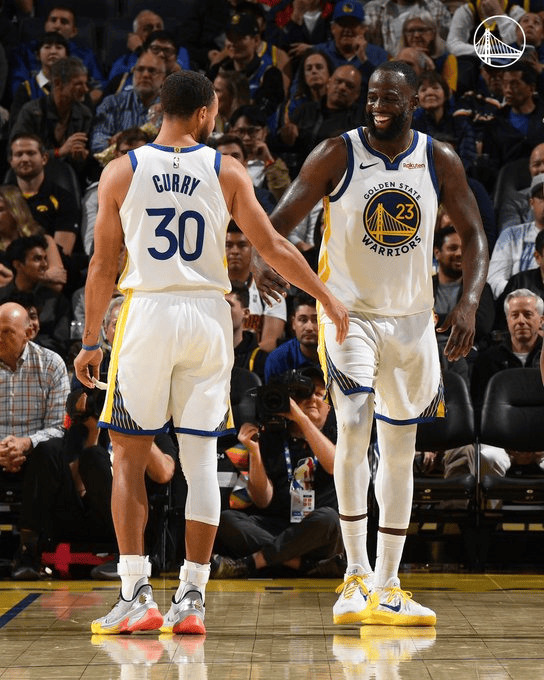 賽后,流言利笑勇士官方曬出斯蒂芬-庫里和德雷蒙德-格林的同框照,與球迷分享。