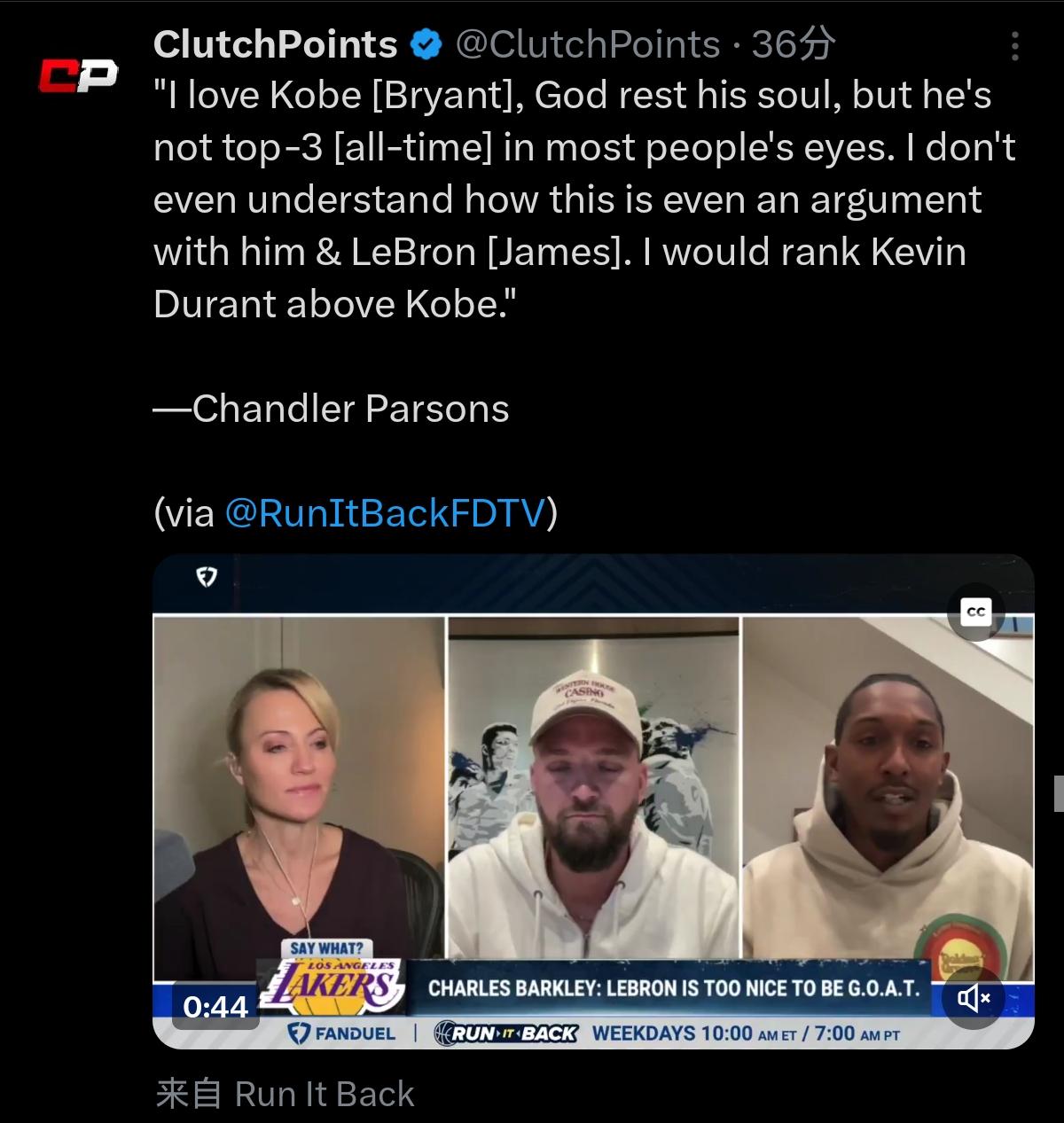 虎撲01月15日訊 今日,前NBA球員錢(qián)德勒-帕森斯在節目上談到了科比??票?/p>