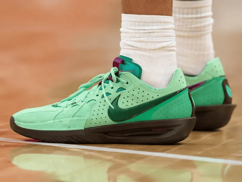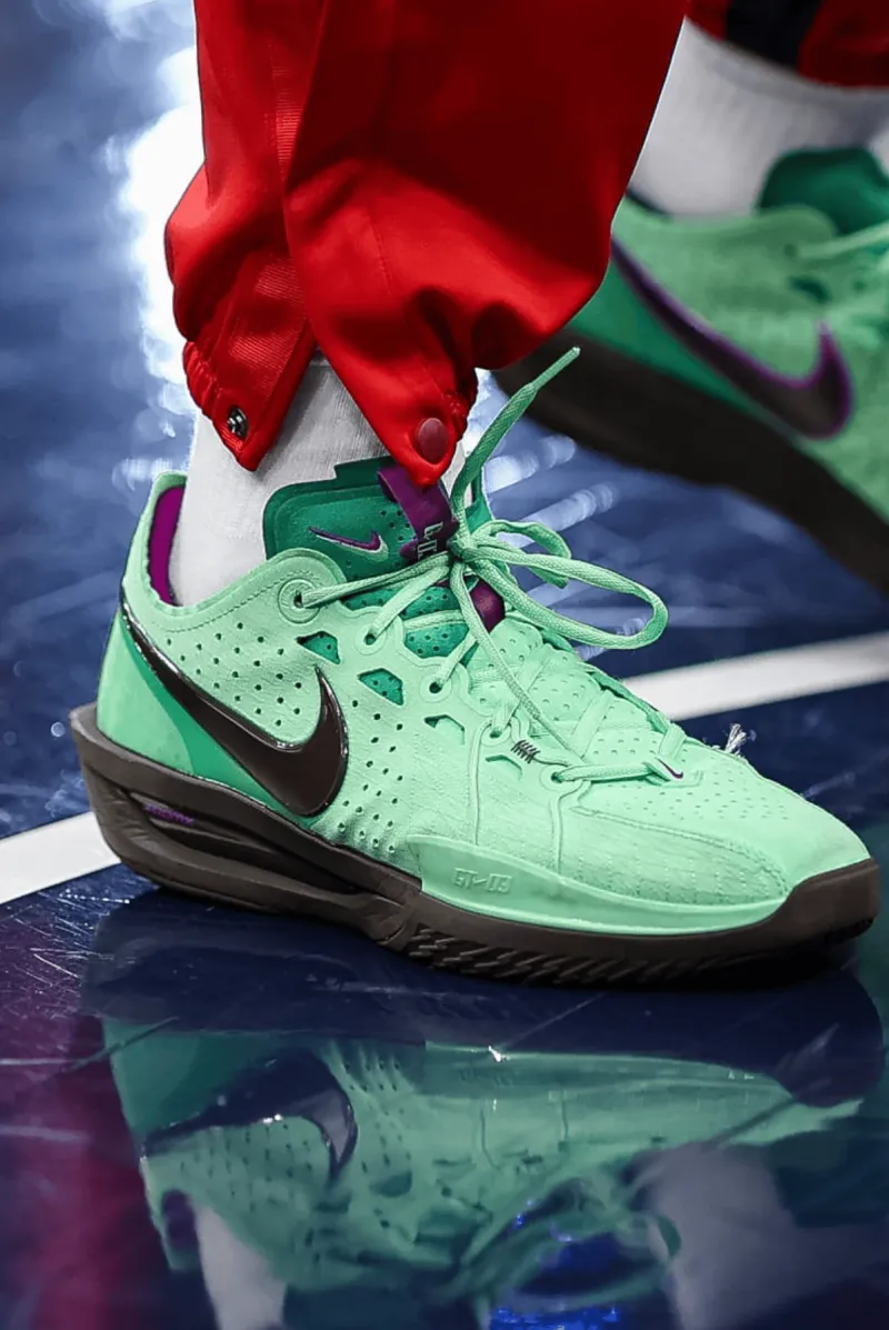 比賽中,普爾上腳個(gè)人專(zhuān)屬綠色Nike G.T Cut3 PE。