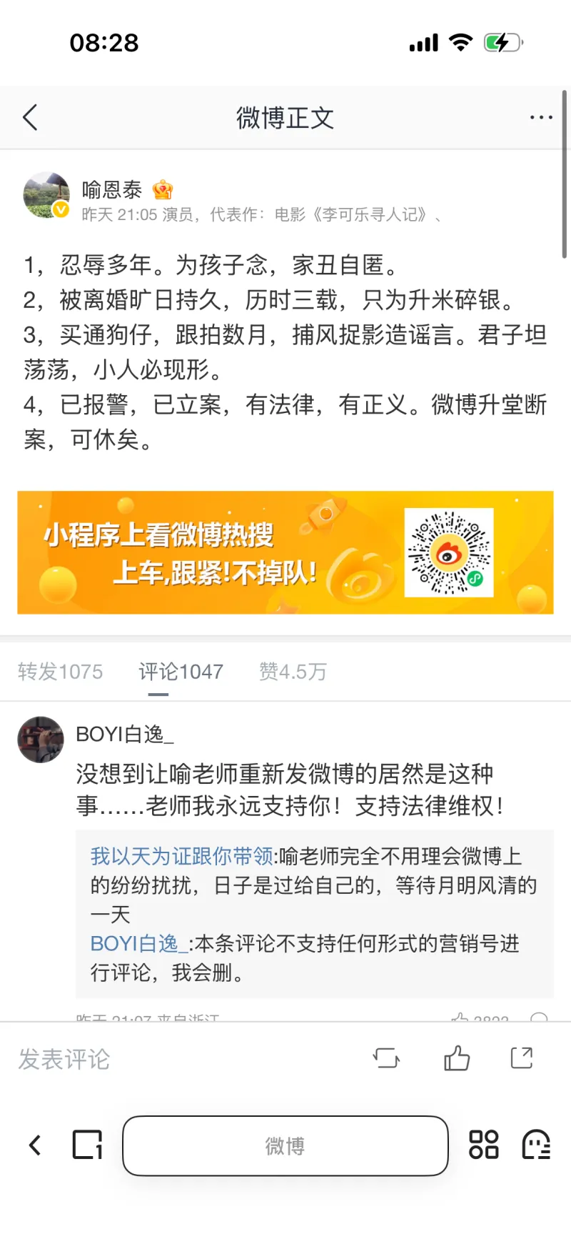 喻恩泰微博回應,喻恩應女女方出軌為了孩子隱忍多年由奔牛牛 發(fā)表在歷史區 https://bbs.hupu.com/history