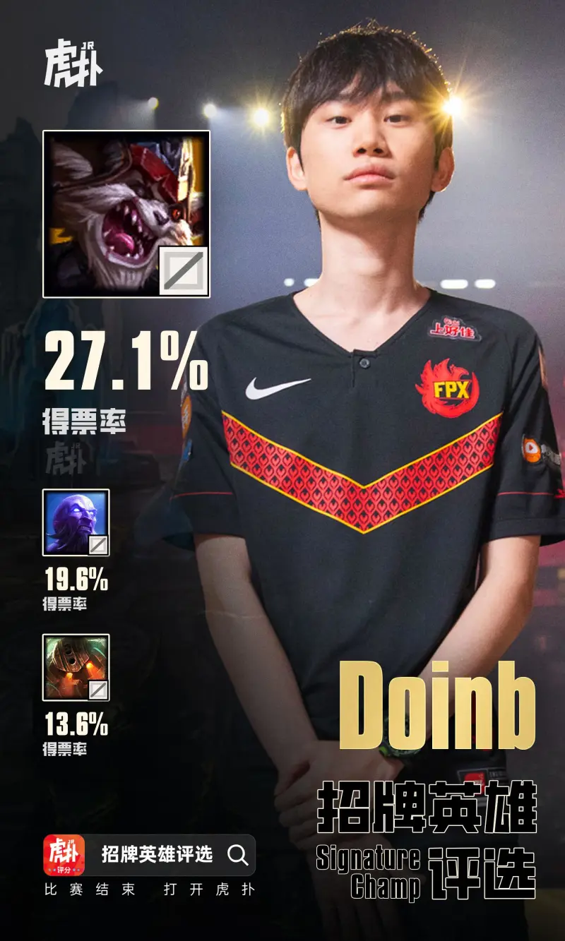 虎撲12月01日訊 經(jīng)過(guò)JRs昨日的評選,克烈以27.1%得票率當選Doinb招牌英雄。洲際招牌