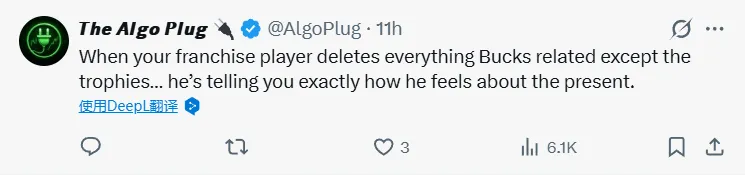 -當你的當家球星刪光所有雄鹿相關(guān)的內容,只留下獎杯時(shí)……他是在用行動(dòng)告訴你,他對現狀的真實(shí)感受。