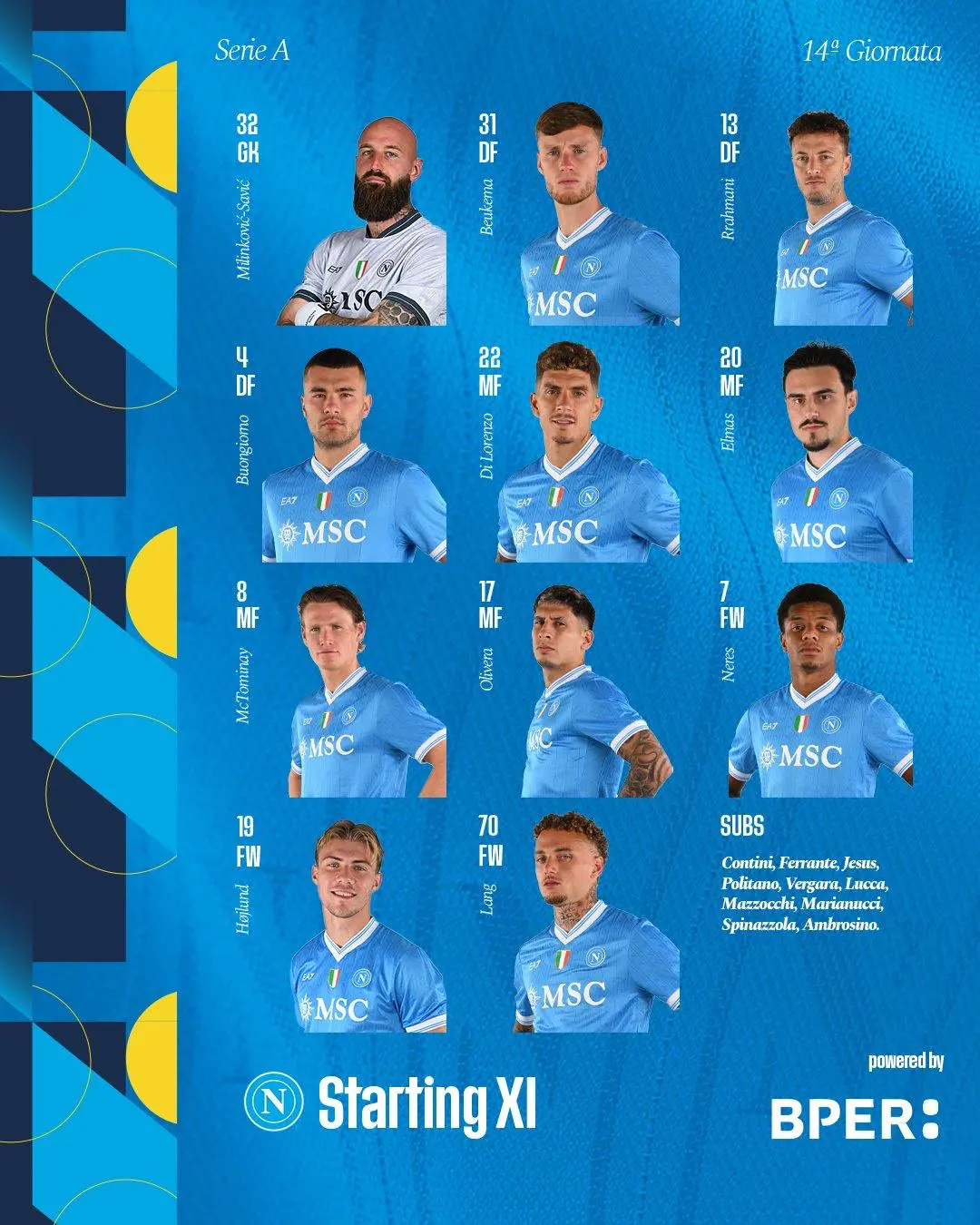 那不勒斯首發(fā):32-瓦尼亞-米林科維奇、31-比克馬、13-拉赫馬尼、4-布翁焦爾諾、22-迪洛倫佐、20-埃爾馬斯、8-麥克托米奈、17-奧利韋拉、7-內雷斯、19-霍伊倫、70-諾阿-朗