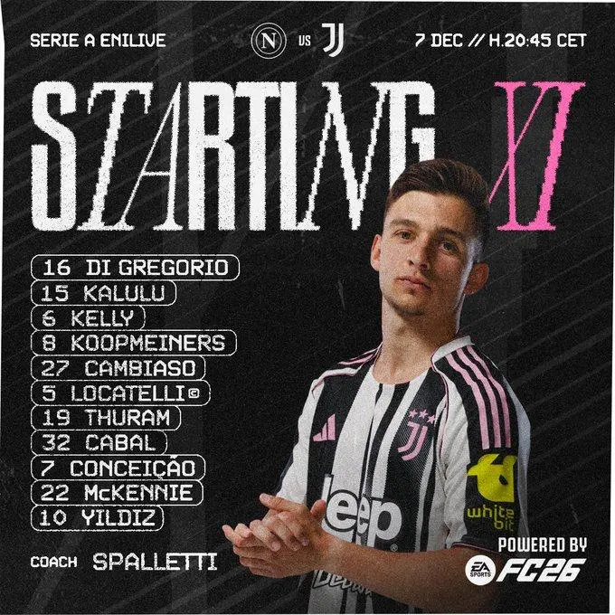 尤文首發(fā):16-迪格雷戈里奧、15-卡盧盧、6-勞埃德-凱利、8-庫普梅納斯、27-安德烈亞-坎比亞索、5-洛卡特利、19-凱夫倫-圖拉姆、32-卡瓦爾、7-弗朗西斯科-孔塞桑、22-麥肯尼、10-凱南-伊爾迪茲