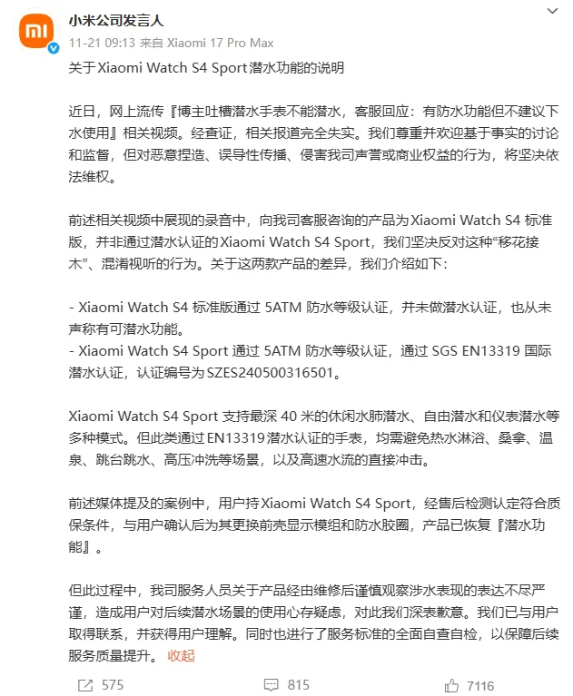 11月21日,小米公司發(fā)言人就網(wǎng)傳“博主吐槽潛水手表不能潛水,客服回應有防水功能但不建議下水”的視頻作出澄清,稱(chēng)相關(guān)報道完全失實(shí)。同時(shí)表態(tài)尊重基于事實(shí)的討論監督,但對惡意捏造、誤導傳播等侵害公司聲譽(yù)的行為,會(huì )堅決依法維權。