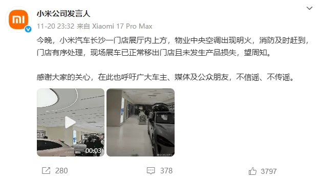 虎撲11月24日訊 11月20日深夜,小米公司發(fā)言人針對長(cháng)沙一門(mén)店展廳出現明火的輿情回應。稱(chēng)明火源自門(mén)店上方物業(yè)的中央空調,消防及時(shí)處置,現場(chǎng)展車(chē)已正常移出且無(wú)產(chǎn)品損失,并非小米汽車(chē)自身出現安全問(wèn)題,并呼吁公眾不信謠、不傳謠。
