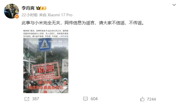 11月23日,小米汽車(chē)副總裁李肖爽發(fā)文辟謠網(wǎng)傳“小喬地鐵站小米M7拿下8殺”的言論,稱(chēng)該信息與小米完全無(wú)關(guān),純屬謠言。新鄭市相關(guān)部門(mén)核實(shí)顯示,事件實(shí)為2025年5月21日因駕駛員操作失誤造成的交通事故,僅4人受傷,并無(wú)人員死亡。小米公關(guān)總經(jīng)理徐潔云也在評論區強調該消息需周知為謠言。